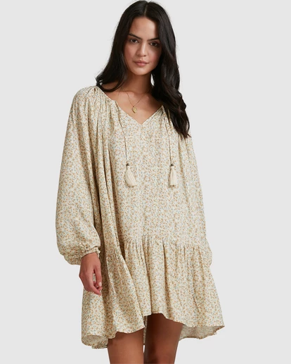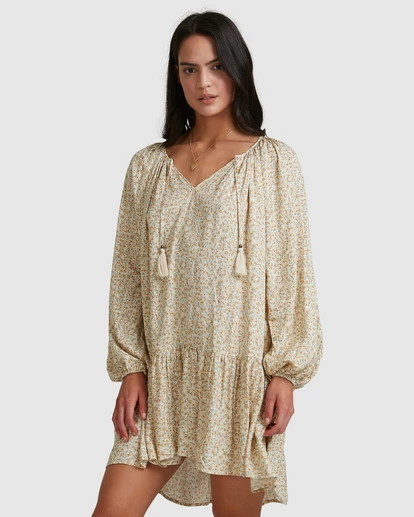 Kiss the sun in the Dream Isle Charmer Mini Dress. The perfect beach layer for lounging or waiting for the waves, this women’s mini dress is made from lightweight rayon fabric with long balloon sleeves and a deep V-neck with tie and tassel details. The summer essential brightens your day with a dreamy floral print.