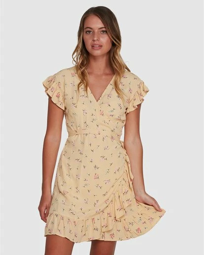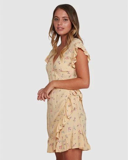 Set a timeless tone in the Pretty Moon floral print mini. A classic feminine silhouette, the wrap dress finds a fresh and feminine look with a ruffle trim at the sleeves and hem.