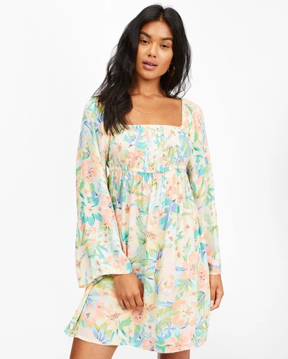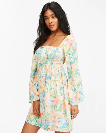 Thriving off saltwater and sunshine, the Tropic Dream long sleeve babydoll dress has us living in a daydream. This women’s mini dress features a colorful print of bright island blooms on crinkle fabric. The floaty fit is styled with long bell sleeves and a straight-across neckline.